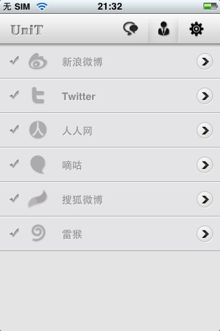 如果你有 Twitter、新浪微博、校内(状态)等多个微博客,同步发表信息一定很烦:来回的切换客户端或 Safari 网页,多次粘贴-发布,而且更新 Twitter 的话还得翻墙(附:在苹果iPhone、iPod touch上设置VPN翻墙的方法)。下面就介绍一个由中国人开发的苹果 iPhone、iPod touch 的多微博同步更新应用软件:UniT,UniT不仅是免费软件,而且同步更新 Twitter 时不用翻墙。